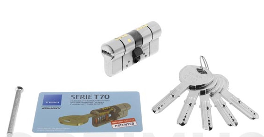 Cilindro de seguridad, doble proteccion contra rotura: ranura fusible y barra de acero reforzada. 6 pitones cargados a muelle. 5 llaves incopiables y patentadas por cilindro. Medida 30 x 40 niquel.
