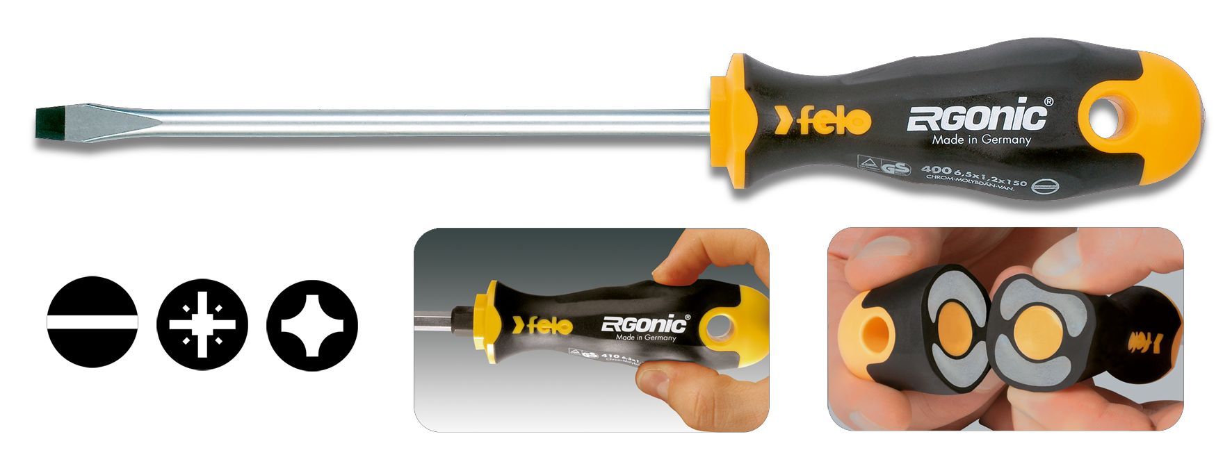 Destornillador FELO ERGONIC. PZ2x100. Exclusivo mango bicomponente ERGONIC, relleno de gel (patentado). Se adapta a la mano, permitiendo un mayor par con menos esfuerzo.