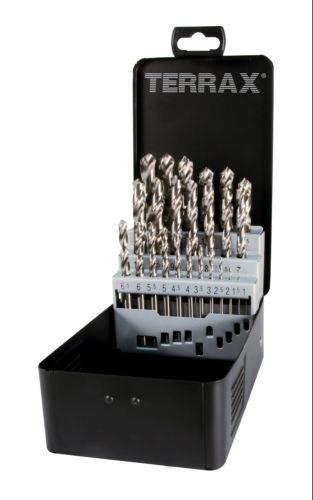 Juego de 25 brocas rectificadas tipo N HSS, de altas prestaciones, adecuadas para todo tipo de taladros, alta concentricidad y precisión rotacional. En caja metálica. 1,0-13,0mmx0,5mm.