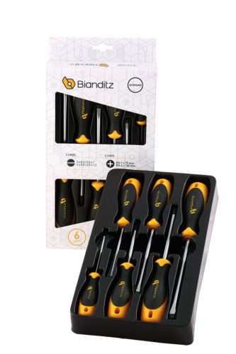 Juego de 6 destornilladores (3x0,5,4x0.8m,5.5x1,6.5x1.2, PH1, PH2, de calidad profesional en acero CrMoV y mango bimaterial con textura rugosa antideslizante, con identificador aflorado, en caja organizadora.)