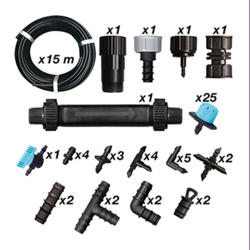 KIT DE GOTEO BÁSICO PARA HUERTO SIN PROGRAMADOR15 m de tuberia de 4mm reductor de presion adaptador hembra 34 16mm adaptador hembra 34 4mm filtro adptador filtro reductor de presion 25 gotero regulables llave de cierre 4 tapones 3 empalmes 4 tes5 codos 2 cruces) de 4 mm (2 empalmes 2 tes 2 codos 2 tapones) de 16mm