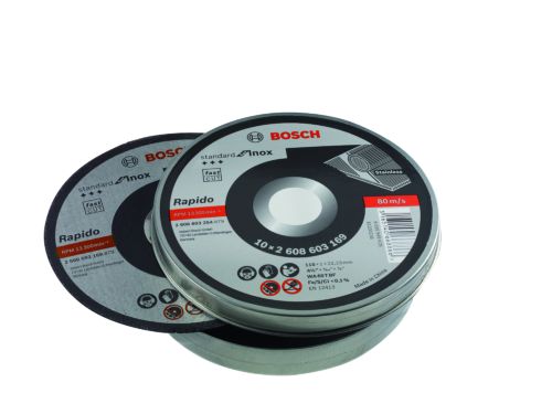 Lata metalica con 10 discos de corte de la gama Standard for para corte de Inox 115 x 1 mm. Cortes limpios, finos y sin rebabas. Gama Standard mas economica. Normativa EN 12143