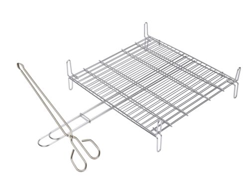 Parrilla reforzada, con mas varillas y mas gruesas que las parrillas convencionales. Grueso de las varillas: 35 mm. Superficie de coccion: 35x40 cm. Patas dobles de 7,5 cm de alto, con una altura total de 15,5 cm. Mango de 34 cm. con cierre de seguridad, que permite un giro facil y seguro. Fabricada en acero inoxidable 188 (AISI 304) electropúlido. Apta para lavavajillas. Fabricacion nacional.