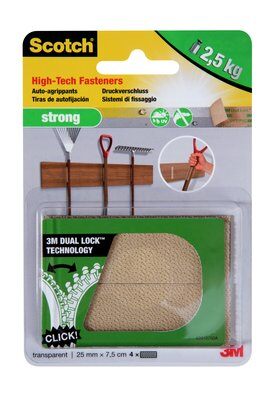 TIRA SUJECCION SCOTCH. Cierres de doble bloqueo que pueden volver a cerrarse y se utilizan para numerosas tareas de adhesion en interiores y exteriores. Resistentes al agua y a los rayos UV. Son la alternativa a cierres como cremalleras y ganchos. Transparentes. 2 conjuntos de dos tiras de 25x75mm.